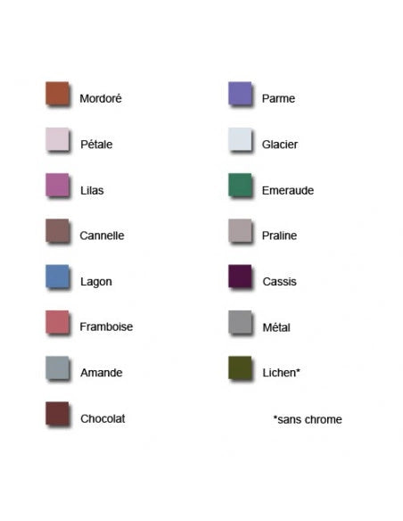 Ce fard à paupières est disponible en 16 teintes: mordoré, cannelle, chocolat, praline, pétale, lagon, parme, cassis, lilas, framboise, métal, neige, lichen, amande, glacier et émeraude.
