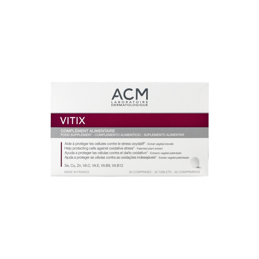 Vitix Comprimés est une formule innovante associant un extrait végétal de melon breveté à un complexe de vitamines (C, E, B9, B12) et de minéraux essentiels (Sélénium, Cuivre, Zinc). Ces micronutriments jouent un rôle clé dans la protection cellulaire : la vitamine C, la vitamine E, le cuivre et le sélénium contribuent à protéger les cellules contre le stress oxydatif, facteur impliqué dans certains déséquilibres cutanés.