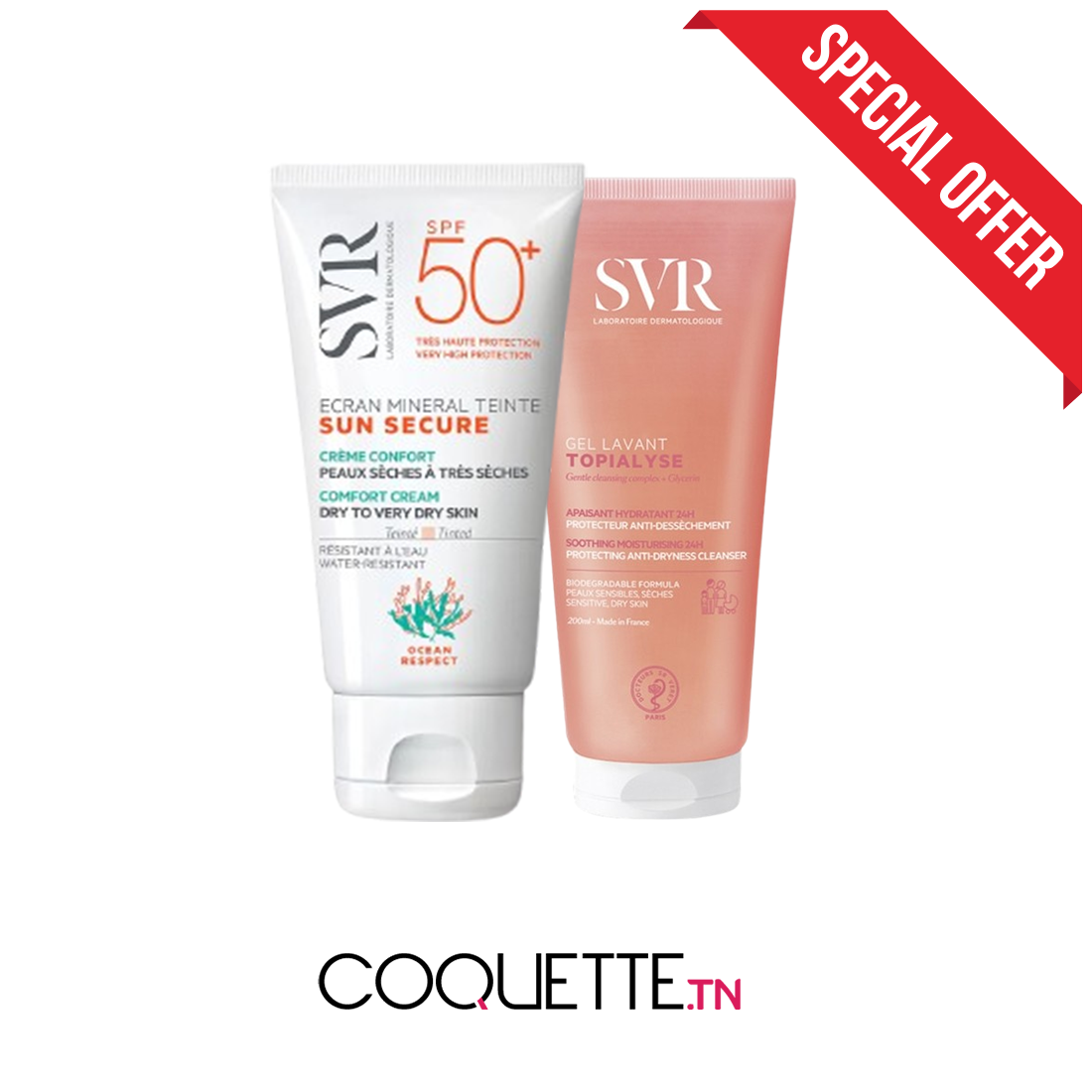 SVR PACK Sun Secure Mineral Teinté spf50+ Peaux Séche + Topialyse Gel Lavant 200ML